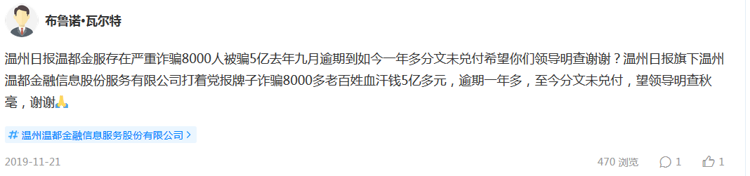温都金服系系温州报业传媒旗下理财平台,自6月28日被立案,警方已发布了三次通报。而自去年6月起,就有不少投资人反应该平台项目逾期拖延兑付。