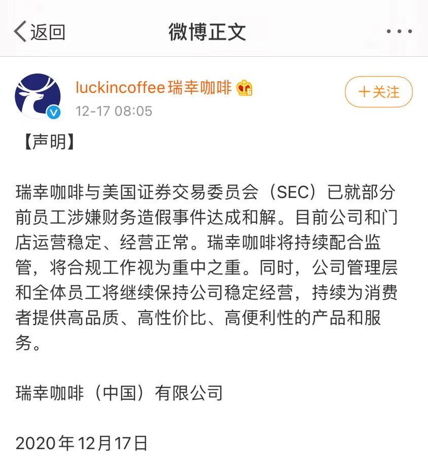 瑞幸咖啡官方微博今日发表声明,称瑞幸咖啡与美国证交会已就部分前员工涉嫌财务造假事件达成和解,目前公司和门店运营稳定、运营正常。