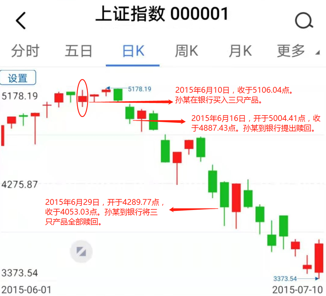 具体来看,2015年6月10日上证综指收于5106.04点,在6月12日一度冲到5178.19点后,之后一个交易日下跌2%,到了6月16日大盘开于5004.41点,也就是在这天孙某第一次向银行方面提出了赎回。