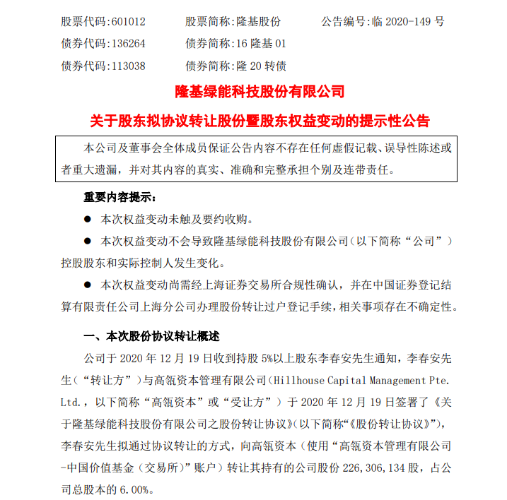 12月20日晚间,隆基股份(601012)公告称,公司股东李春安与高瓴资本于12月19日签署了《股份转让协议》,李春安拟通过协议转让的方式,向高瓴资本转让其持有的公司股份2.26亿股,占公司总股本的6.00%;本次交易对价总额为158.4亿元。