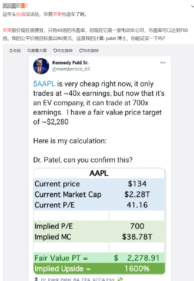 有网友甚至调侃说,苹果股价现在很便宜,只有40倍的市盈率,但现在它是一家电动车公司,市盈率可以达到700倍。公平价格目标是2280美元!
