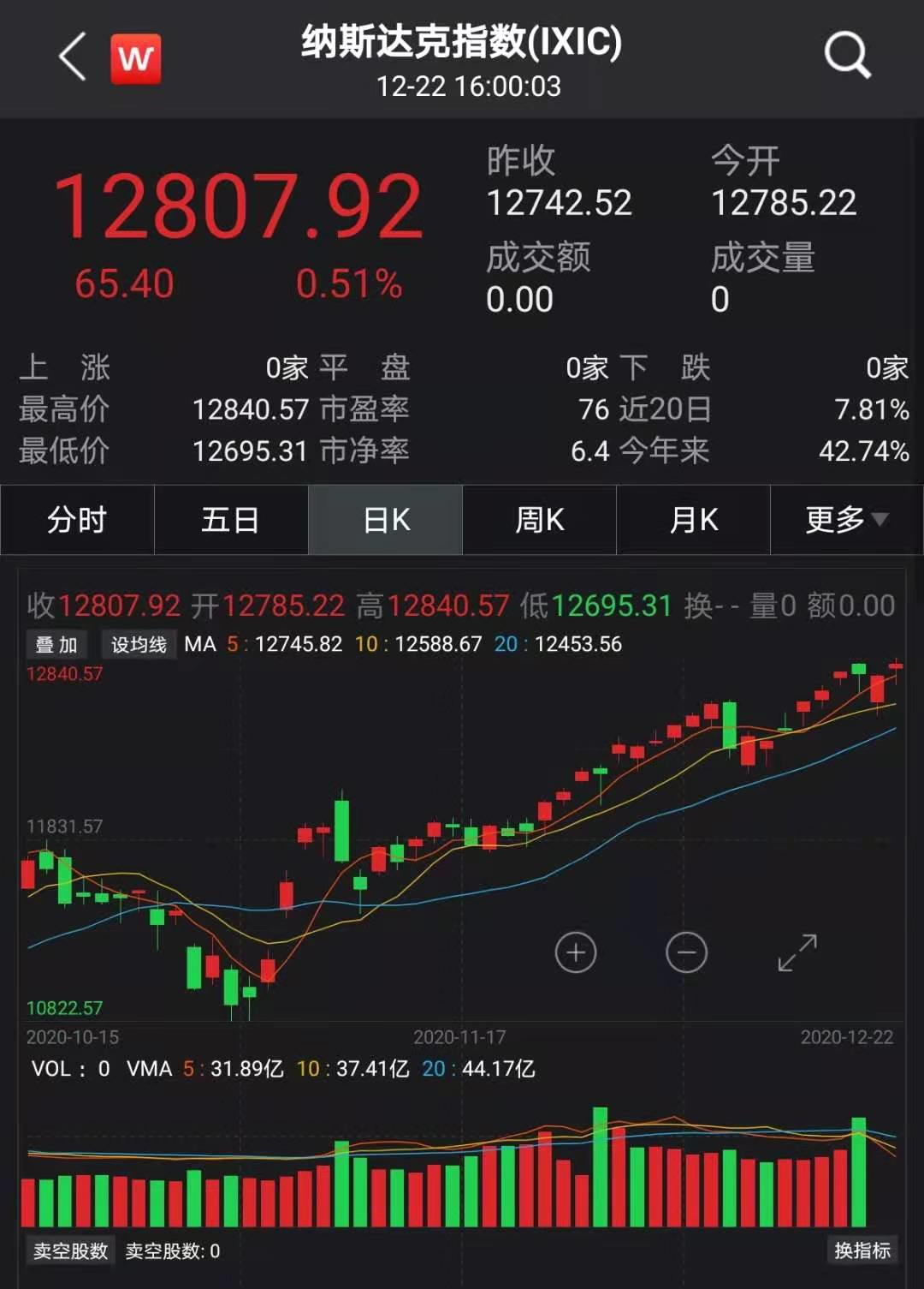 周二美国三大股指收盘涨跌不一,道指跌0.67%报30015.51点,标普500指数跌0.21%报3687.26点,纳指涨0.51%报12807.92点,再创新高。