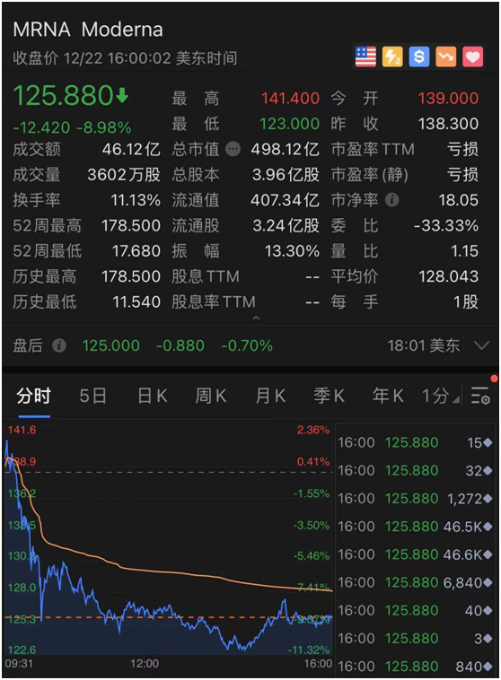 Moderna大跌8.98%,Biontech下跌5.54%,阿斯利康下跌1.91%,辉瑞下跌1.71%。
