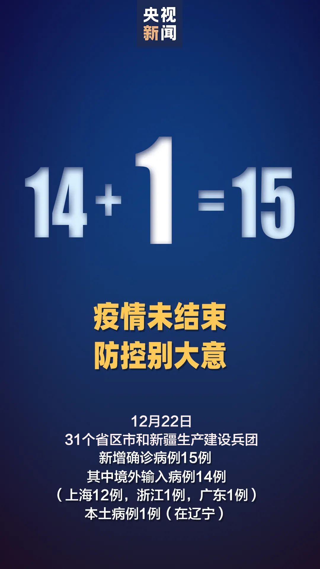据国家卫健委消息,22日0时至24时,31个省(自治区、直辖市)和新疆生产建设兵团报告新增确诊病例15例,其中境外输入病例14例,本土病例1例(在辽宁)。