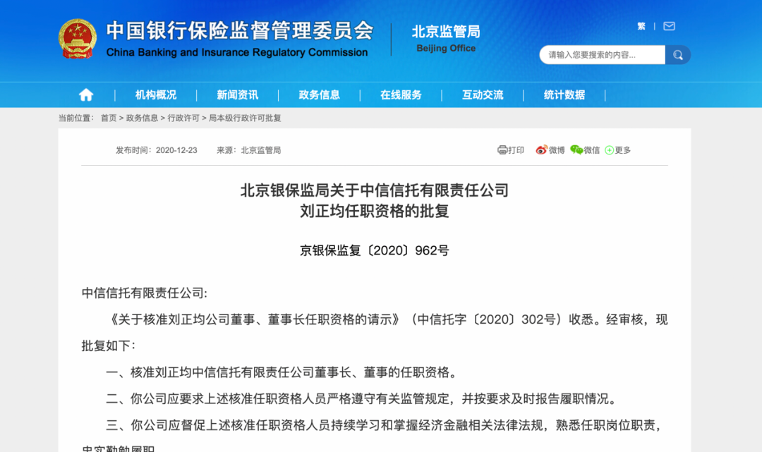 12月23日,北京银保监局发布批复,核准刘正均出任中信信托董事长、董事的任职资格。