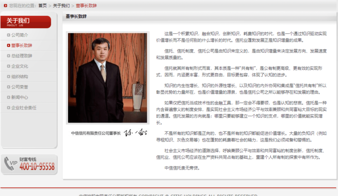 此前,在中信信托官网上,陈一松在“董事长致辞”中表示,信托是一种内含普遍意义的制度安排,是实现社会主义市场经济公平与效率兼顾和共同富裕大目标的现实的通道。信托发展的方向就是:哪里只要能够建立一个知识的支点,哪里的价值就能实现增长。