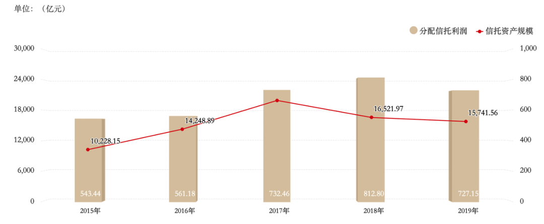 据其官网显示,中信信托七年间已为投资人分配收益4000亿元。截至2019年底,中信信托的信托资产规模达1.57万亿元,其中主动管理业务规模为7258.6亿元,被动管理信托资产为8482.9亿元。