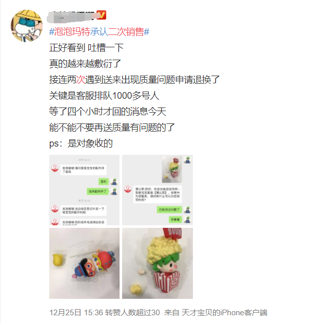 有多位网友表示,泡泡玛特的产品质量也很差,拆开还有难闻的味道;还有网友表示,泡泡玛特客服送来的产品质量也屡次出问题。