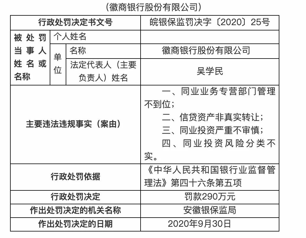 安徽银保监局依据《中华人民共和国银行业监督管理法》相关规定,对徽商银行作出罚款290万元的行政处罚决定。作出该处罚决定的日期为2020年9月30日。