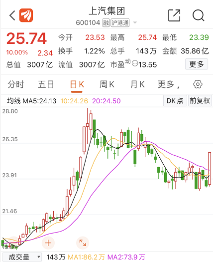 12月28日,上汽集团高开高走,午后迅速封板成功,以25.74元每股的价格收盘,当日成交35.86亿元,市值达到3007亿。