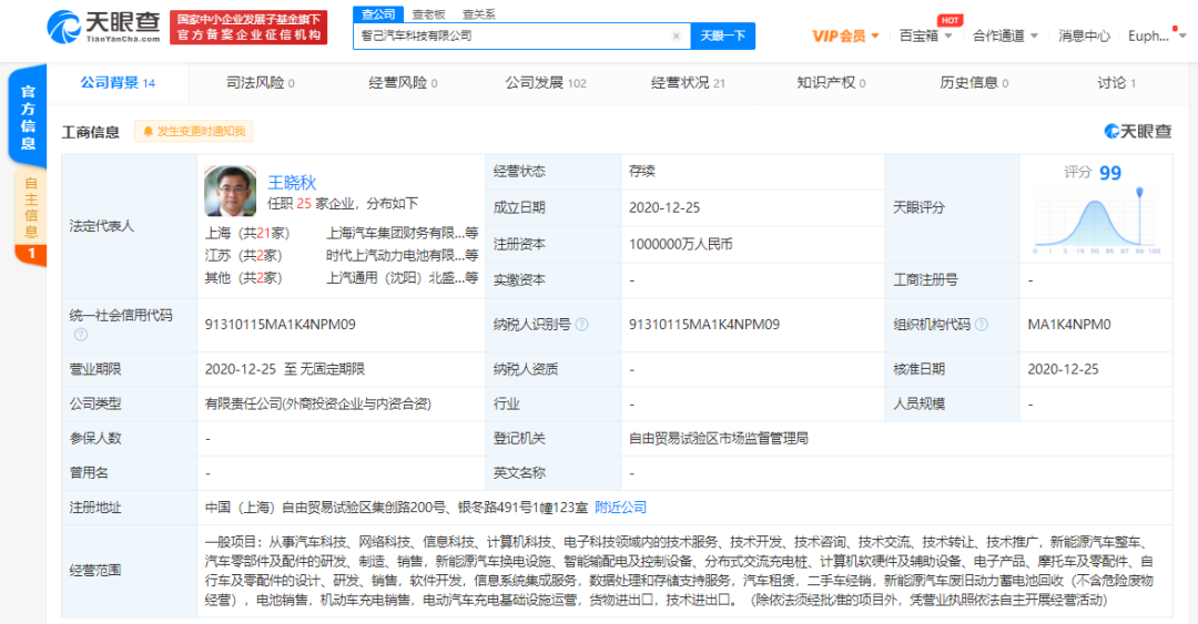 天眼查App显示,12月25日,智己汽车科技有限公司注册资本100亿人民币,法定代表人为王晓秋,经营范围包含:从事汽车科技、网络科技、信息科技、计算机科技、电子科技领域内的技术服务等。最大股东为上海元界智能科技股权投资基金合伙企业(有限合伙),持股比例72%,后者为上汽集团控股子公司;阿里巴巴(中国)网络技术有限公司持股18%,为第二大股东。