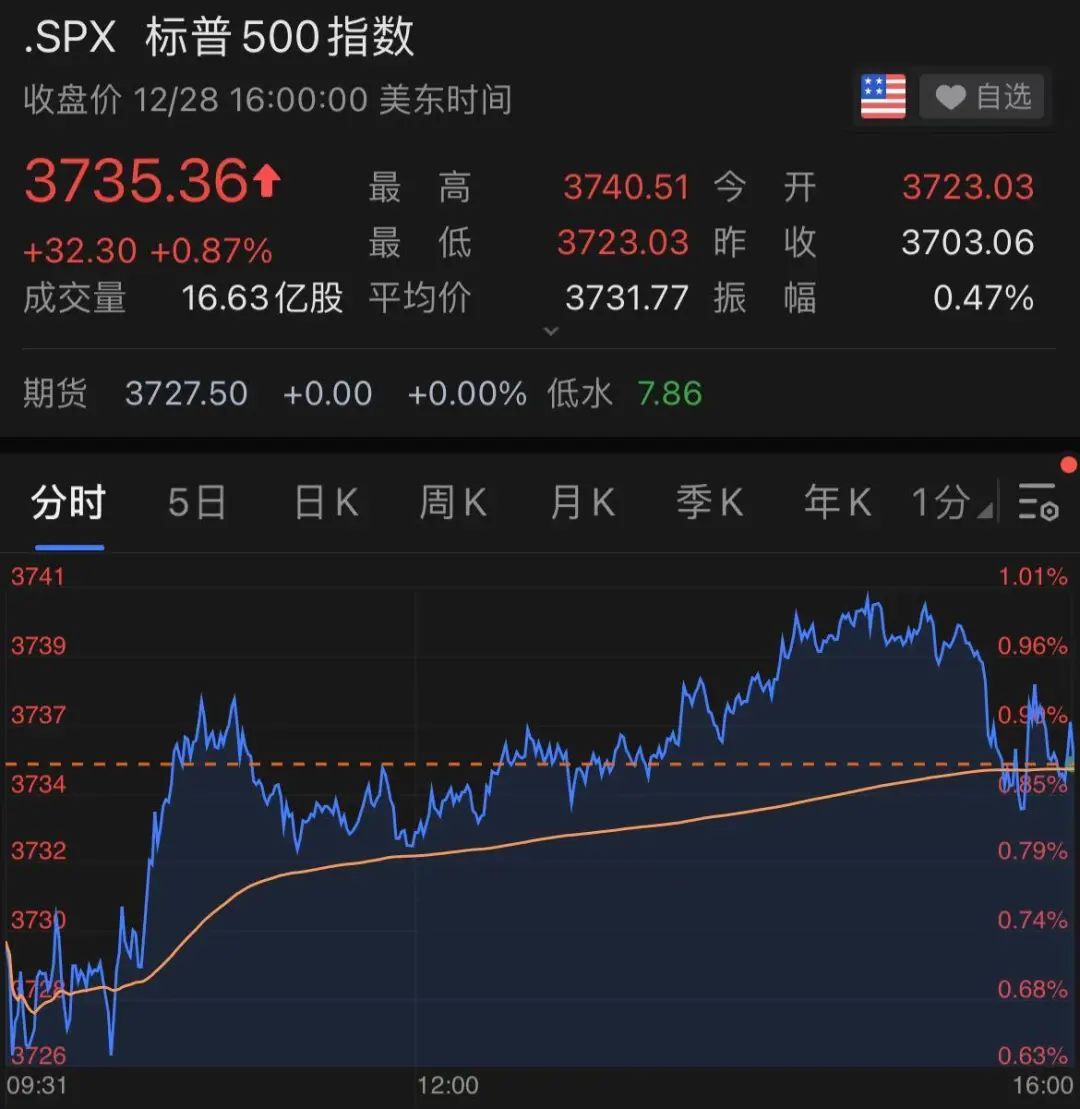 截至收盘,标普500指数收涨32.30点,涨幅0.87%,报3735.36点,连涨三日并创收盘史高。