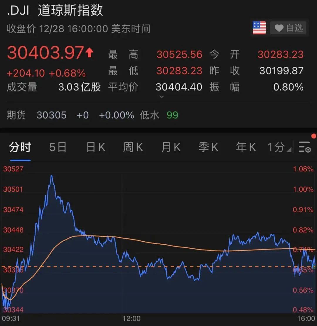 道琼斯工业平均指数收涨204.10点,涨幅0.68%,报30403.97点,连涨三日并创收盘史高。