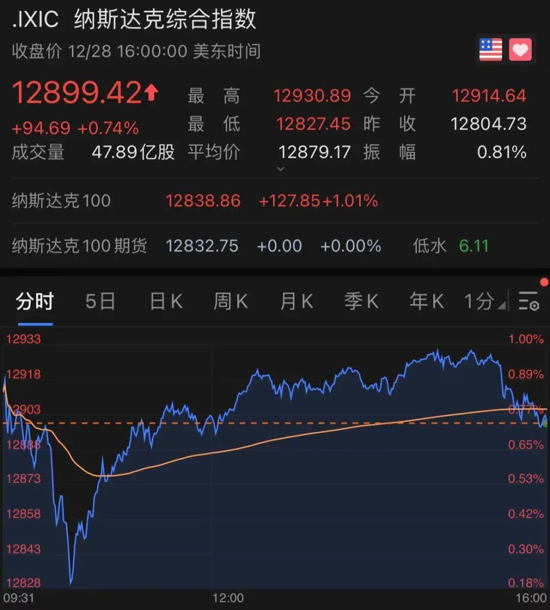 纳斯达克综合指数(纳指)收涨94.69点,涨幅0.74%,报12899.42点,连涨两日并创收盘史高。