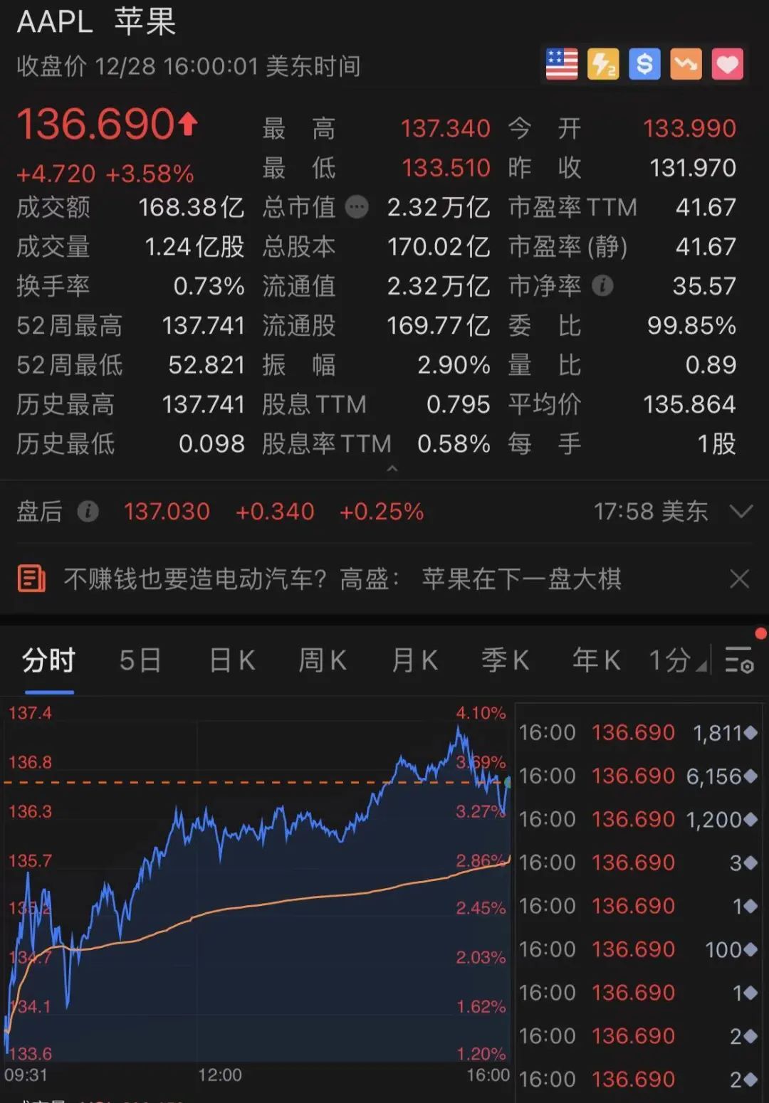 大型科技股也普涨,苹果涨3.6%,领涨道指成分股并创收盘史高,Facebook涨3.6%,亚马逊涨3.5%,微软和奈飞涨1%,谷歌母公司Alphabet涨2.3%。
