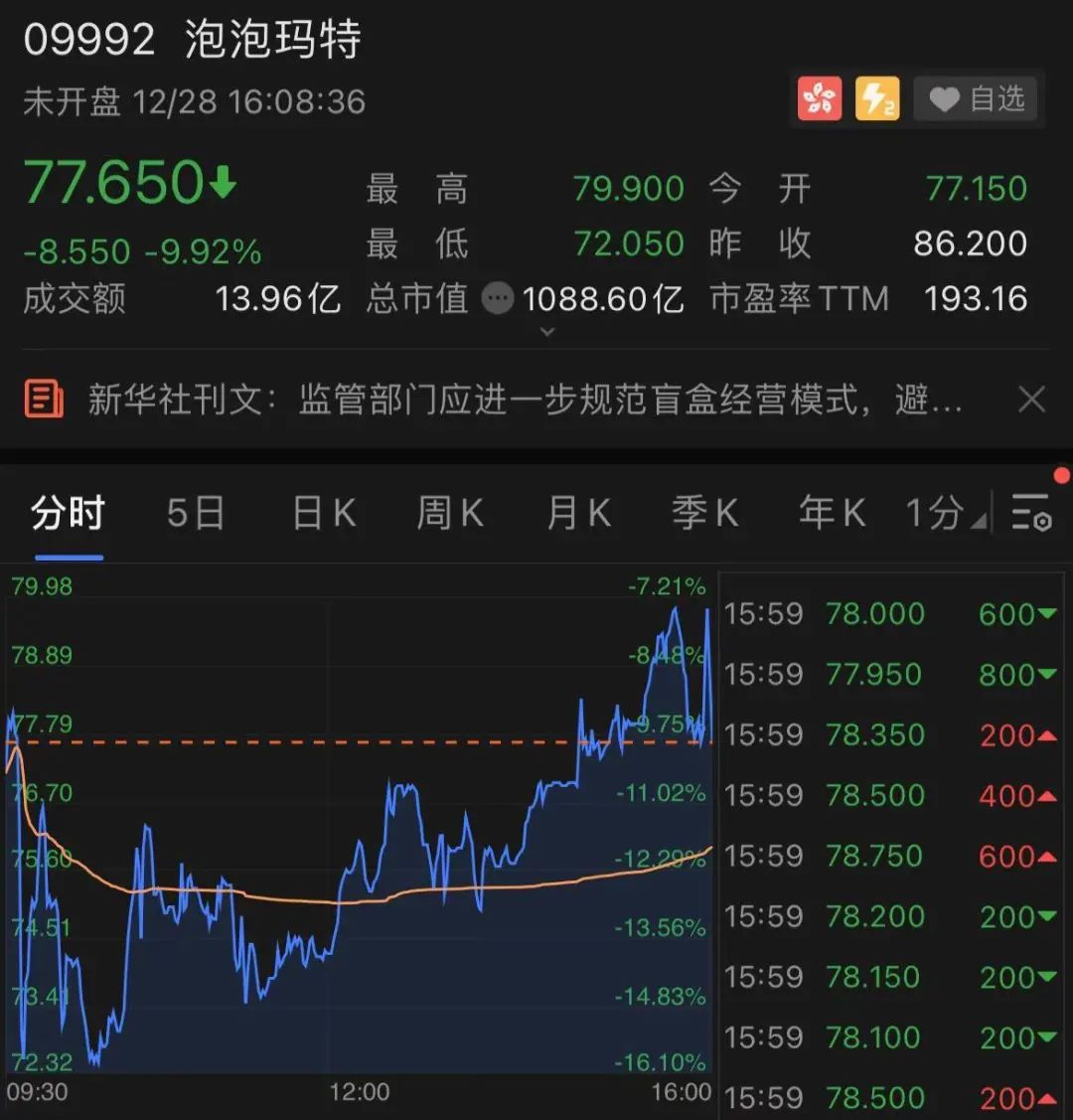 受此影响,名创优品大跌17%,“盲盒第一股”泡泡玛特也大跌近10%。