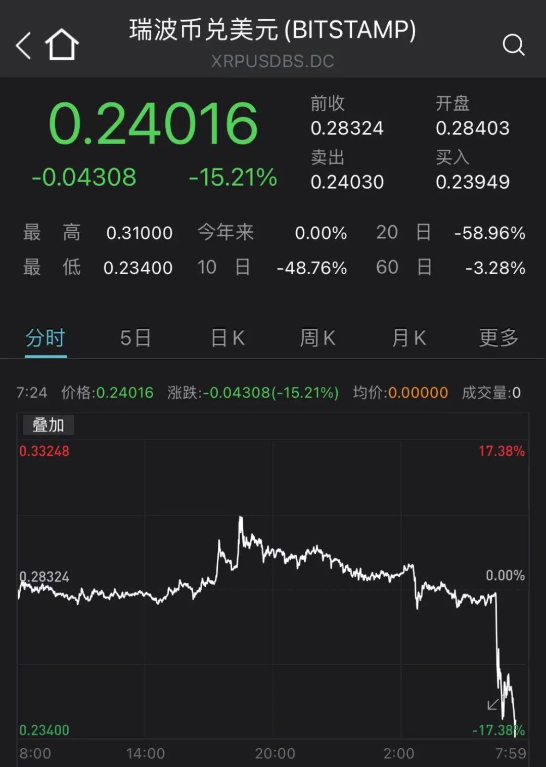 瑞波币闪崩,一度大跌17%。