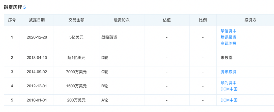 天眼查数据显示,这是丁香园的第五轮融资。此前于2010年丁香园完成A轮融资,由DCM中国投资200万美元,并入驻杭州高新区(滨江)获得杭州市政府设立的创投引导基金投资;2年后丁香园再次获得B轮融资,公司增资至1500万美元,B轮融资由雷军旗下的顺为资本领投,DCM跟投。