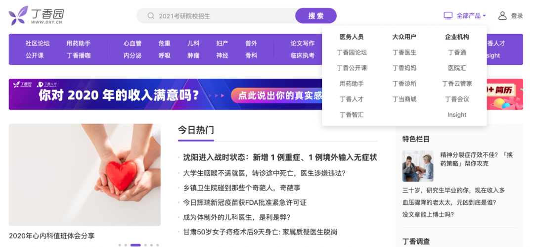 目前,丁香园拥有丁香人才网、丁香通、丁香客、用药助手、丁香医生、PubMed中文网、调查派、丁香会议等等产品。网站旗下有丁香人才、丁香会议、丁香通、丁香客、用药助手、PubMed中文网、调查派等多个网站产品。