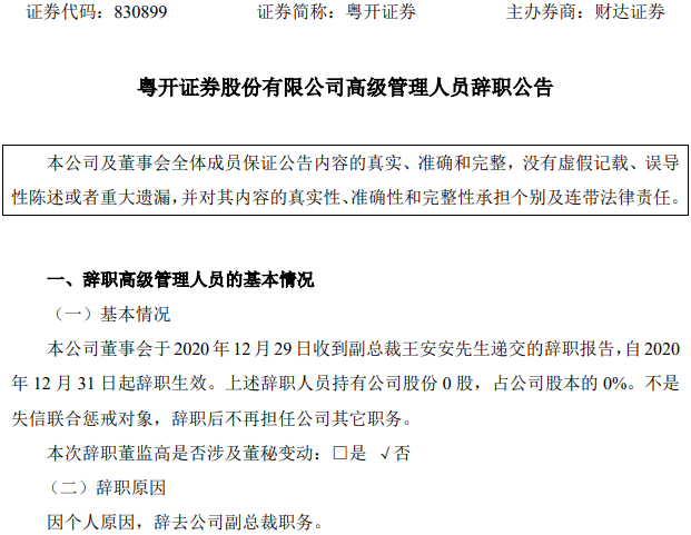 2020年年底,就职仅4个月的粤开证券分管投行副总裁王安安就宣布辞职。