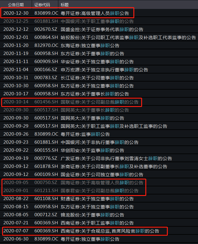 事实上除了粤开证券,在刚刚过去的2020年,还有不少券商高管同样经历了变动。