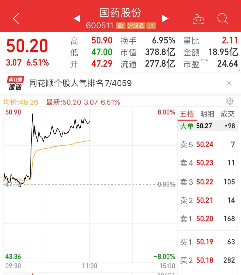 利好消息刺激,国药股份上午盘中直线拉升,上午收盘,国药股份大涨6.51%,收报50.2元。