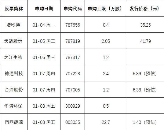2021年首批7只新股中,目前只有1月4日(周一)、5日(周二)的两只新股浩欧博与天能股份发行价确定,分别为35.26元,以及41.79元。不过,如果按照约23倍的市盈率预估,1月8日(周五)发行的南网能源发行价预估为1.4元。