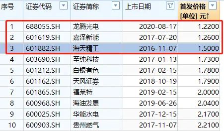 发行价1.5元及以下的新股,分别为发行价1.22元的龙腾光电、发行价1.26元的嘉泽新能、发行价1.5元的海天精工。龙腾光电于2020年8月在科创板上市,上市首日涨幅超7倍,低2天股价就暴涨至15元,涨幅超10倍。
