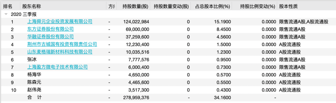 从目前的股东情况来看,仍有不少机构投资者在列。数据显示,截至2020年3季度末,东方证券股份有限股份持股数量为6900万股,占总股本比例8.45%;华融证券持股数量为3725.96万股,持股占比4.56%。