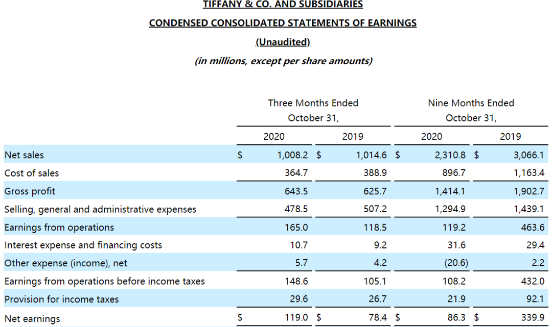 据Tiffany此前公布的业绩报告来看,截至4月30日的2020财年第一季度中,Tiffany净销售额同比下降45%至5.56亿美元,净亏损6460万美元;在截至7月31日的3个月内的二季度中,Tiffany净销售额比上年同期下降29%至7.47亿美元,净利润为3200万美元。