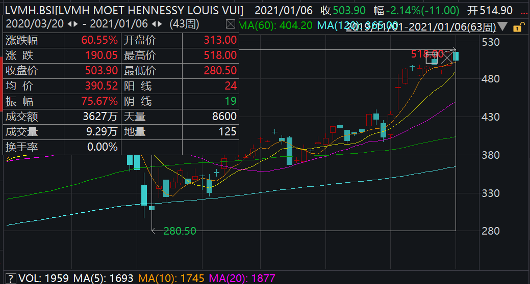 不过很快,LVMH的股价便触底反弹了,去年三月中至今,该公司股价涨幅超过60%,市值一度超过2500亿欧元(约合2万亿元人民币)。