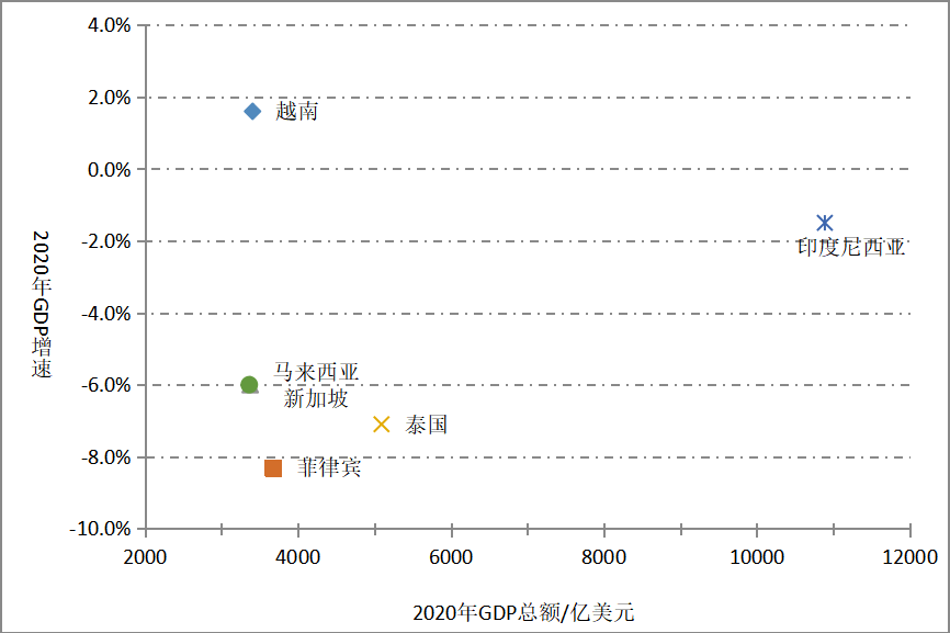 图3:2020年东南亚六国GDP增速及绝对数(预测)