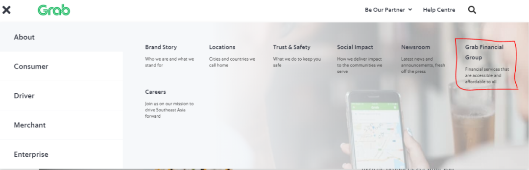 图5:Grab官网的金融板块定位
