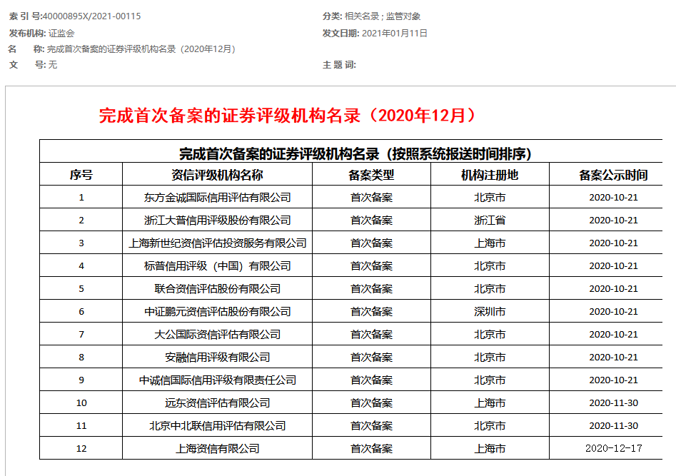 2021年1月11日,证监会公布完成首次备案的证券评级机构名录(2020年12月),从去年10月份《证券市场资信评级业务管理办法》正式实施至去年末两个月时间,已有12家证券评级机构完成备案。其中上海资信有限公司于去年12月份完成备案。