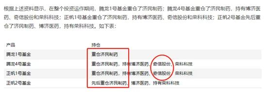 在整个投资运作期间,腾龙1号基金重仓了济民制药;腾龙4号基金重仓了济民制药,持有博济医药、奇信股份和荣科科技;正帆1号基金重仓了济民制药,持有博济医药、奇信股份和荣科科技;正帆2号基金先后重仓了济民制药、博济医药,持有荣科科技。
