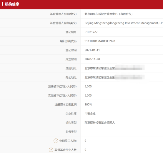 基金业协会信息显示,北京明晟东诚投资管理中心(有限合伙)成立于2020年11月20日,注册资本5005万元人民币,办公地在北京市东城区。该机构在2021年1月11日完成私募证券投资基金管理人备案,目前公司有9名员工。