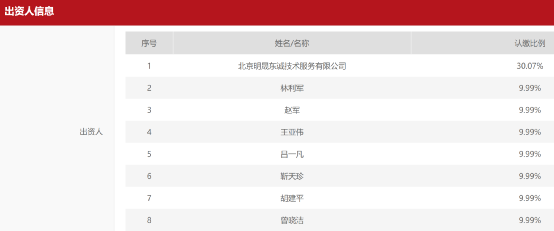 值得注意的是,北京明晟东诚投资的股东阵容,由北京明晟东诚技术服务有限公司持股30.07%,同时有7名自然人股东,都是我们耳熟能详的资管圈大佬,包括正心谷资本创始人林利军、淡水泉投资总经理赵军、千合资本总经理王亚伟、煜德投资执行事务合伙人靳天珍、拾贝投资董事长胡建平、源乐晟资产创始合伙人曾晓洁、睿泉毅信投资总经理吕一凡,他们均持股9.99%。