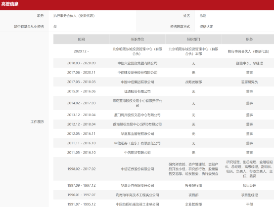 基金业协会备案登记信息显示,北京明晟东诚投资的执行事务合伙人是原中信证券执行委员会委员徐刚。从他的工作履历可以看到,徐刚毕业于中国人民大学、南开大学,1997年进入证券行业,担任华夏证券投资银行部项目经理。