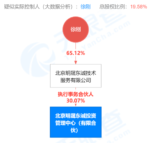 天眼查信息也显示,徐刚也是北京明晟东诚投资的大股东北京明晟东诚技术服务有限公司的最大持股股东,持有65.12%的股权,也就是北京明晟东诚投资的实际控制人。
