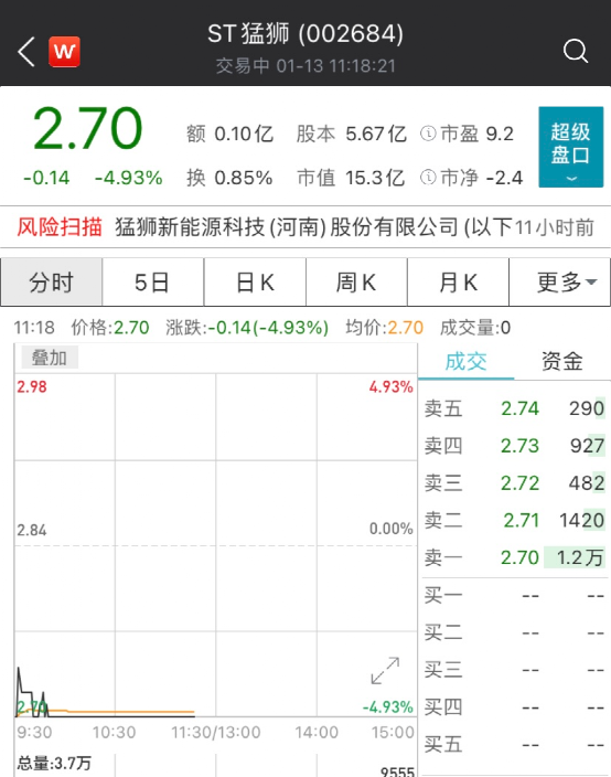 受消息影响,ST猛狮现已跌停,截至发稿,ST猛狮报2.7元,最新总市值为15.3亿元。