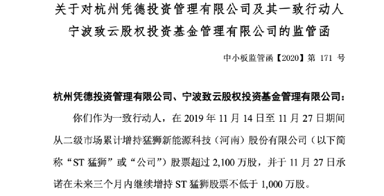 此前,深交所公布深市监管动态时共对11宗违规行为发出监管函,10宗涉及信息披露及规范运作违规,其中就有提及,猛狮新能源科技(河南)股份有限公司股东杭州凭德投资管理有限公司及其一致行动人宁波致云股权投资基金管理有限公司未完成其增持承诺。