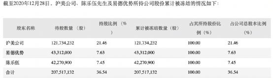 不过在2020年12月31日,ST猛狮公告称,公司控股股东沪美公司、实控人之一陈乐伍先生及其一致行动人公司持股 5%以上股东易德优势累计被冻结的股份数量为2.07亿股,占其所持公司股份比例的100%,占公司总股本的36.54%。
