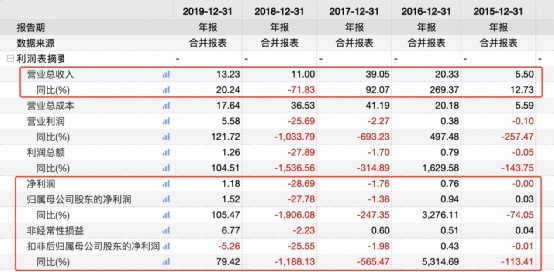 在被各类负面新闻缠身的情况下,ST猛狮近年来经营业绩也令人堪忧,十分不稳定。2017年营业总收入虽然较2016年有大幅上升,不过当年的归母净利润亏损1.38亿元,同比下跌247%。2018年业绩依然糟糕,营业总收入11亿元,同比下跌72%;归母净利润为27.78亿元,同比大降1906%,业绩暴雷。