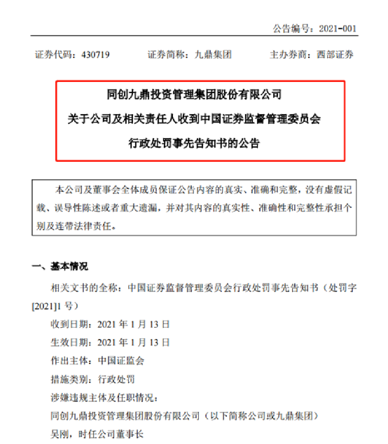 九鼎集团表示,该公司、九鼎控股及相关责任人诚恳接受上述行政处罚决定。