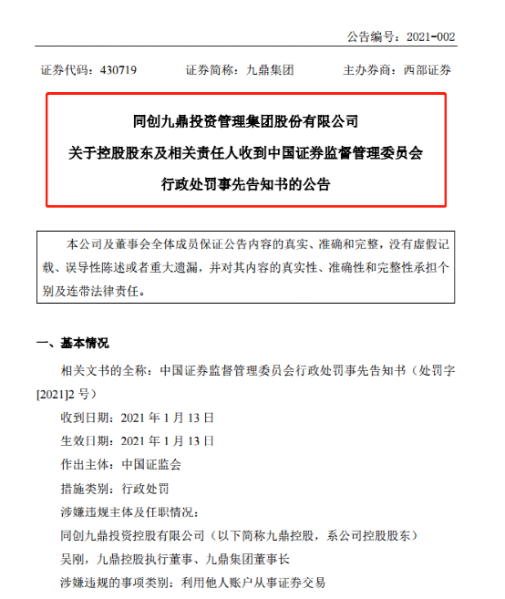 中国证监会拟决定责令同创九鼎投资控股有限公司改正,没收违法所得 5.01亿元, 并处以 1亿元罚款;对吴刚给予警告,并处以100,000元罚款。