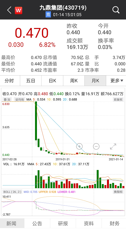 截至1月14日,九鼎集团的股价仅有0.47元,总市值为70.5亿元。