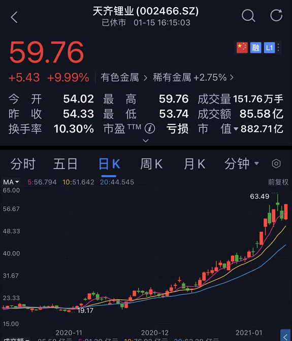 受益于新能源汽车产业链的全面景气,又在此利好消息刺激下,天齐锂业股价近期强势反弹,最新数据显示,周五该股涨停,报收59.76元,成交85.58亿元,最新市值高达882.7亿元。此前一个月时间,天齐锂业股价启动上涨,截至今日累计涨幅超200%。