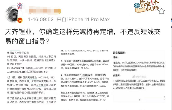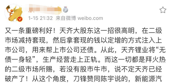 在此次定增方案发布前,公司曾披露了一项减持计划。天齐锂业1月6日发布公告称,控股股东天齐集团及其一致行动人拟合计减持不超过公司总股本4%的股份,减持原因为:向公司提供财务资助及其他资金需求。