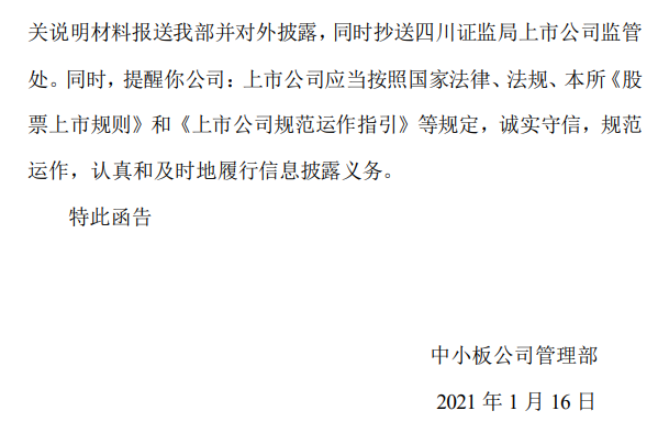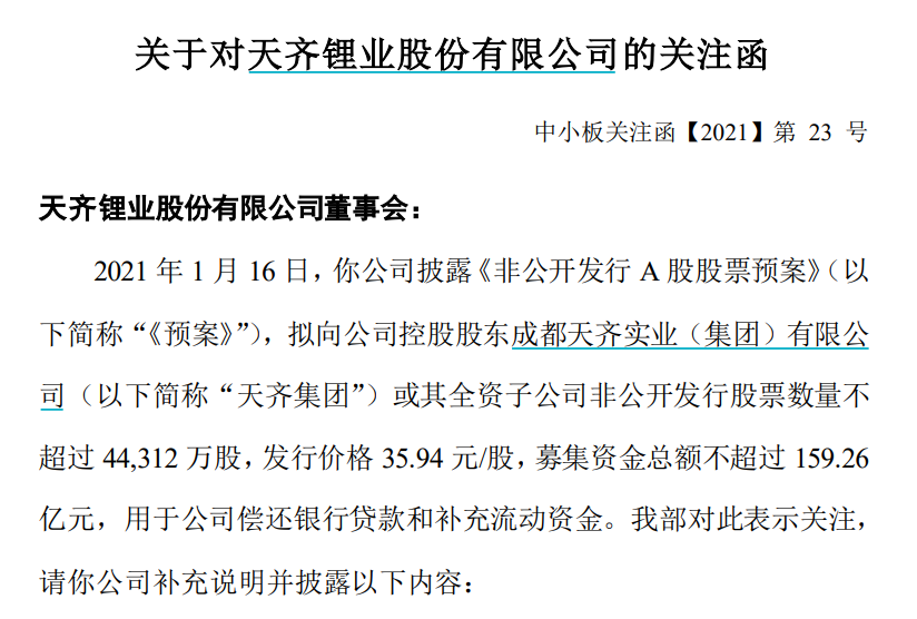 2021年1月16日,深交所向天齐锂业发出关注函。
