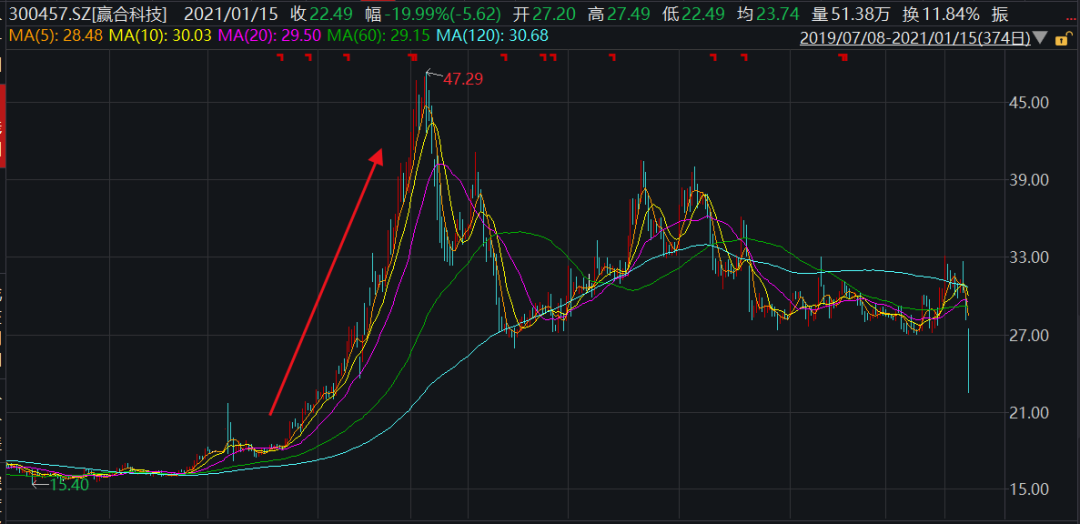 正是此时,赢合科技股价迎来大爆发,从2019年年末,股价从17元附近,一路涨至2020年3月份的47元高点,涨幅约180%。